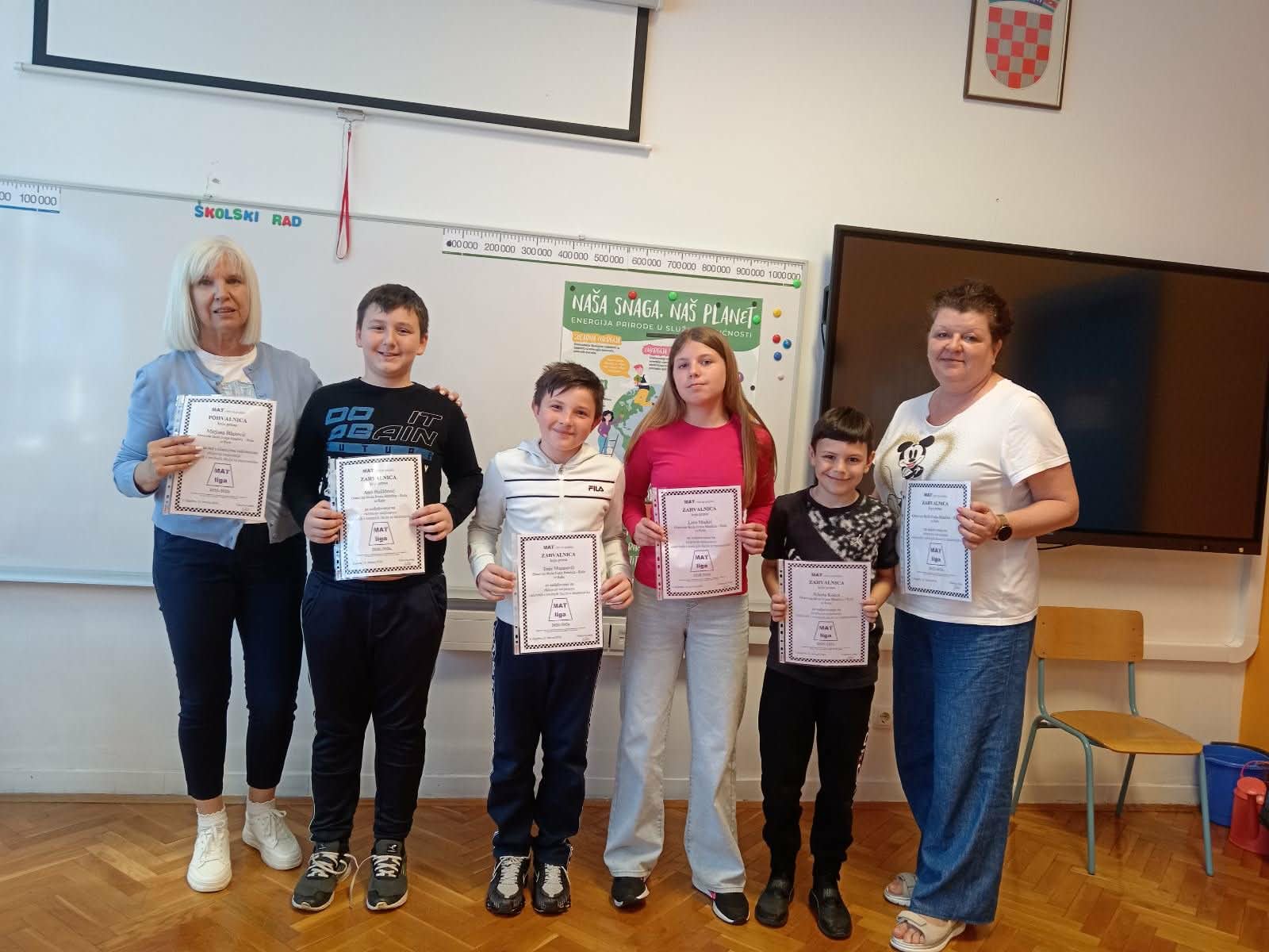Po završetku četvrtog kola, učenicima su uručene zahvalnice za sudjelovanje u Mat ligi, dok je mentorica primila pohvalnicu. Priznanja je uručila ravnateljica škole Greis Franković. Čestitamo učenicima i mentorici na trudu, zalaganju i uspješnom predstavljanju škole!