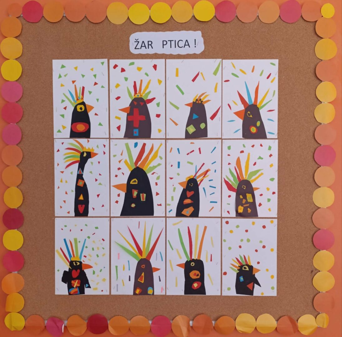 Učenici prvoga razreda sa učiteljicom Draganom Macura čitali su priču iz usmene narodne predaje “Žar ptica” kao poticaj za likovnu aktivnost. Kroz priču dobili su ideje za oblik i kretanje ptice, a zatim su ih prenijeli u likovni rad tehnikom kolaža. Učili su kako rezati, slagati i lijepiti različite oblike papira te stvarati ritam ponavljanjem elemenata.